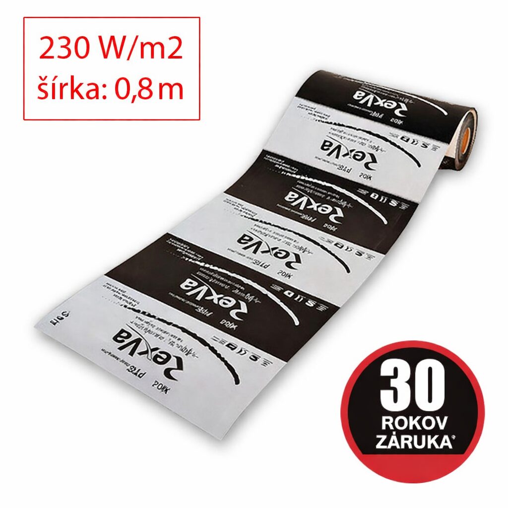 PTC fólie 3. generácie s vykurovacím výkonom 230W/ m2, šíky 80 cm, ktorá nám poskytujú vykurovací výkon s dostatočnou rezervou, pre všetky montážne aplikácie (strop, stena, podlaha v kombinácii plávajúca podlaha, poter, sadrokartón, keramika atď.) a požitie v priestoroch rôznych tepelno-technických potrieb. Vyšší výkon fólie nám eliminuje riziká nedostatočného nadefinovania tepelnej potreby v miestnosti, efektívnej a nízkej spotreby, rýchleho nábehu kúrenia do pocitovej teploty bez preťažovania vykurovacieho systému fólie a to v cenovej relácii štandardných fólii s nižším výkonom. Obmedzenie alebo zvýšenie výkonu sa reguluje termostatom s podlahovým snímačom.